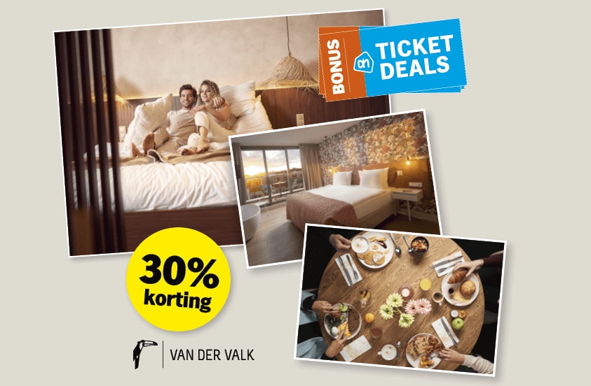 Collage van een gezinskamer, een tweepersoons hotelkamer, en een ontbijttafel bij Van der Valk, met 30% korting en AH Ticket Deals promotie