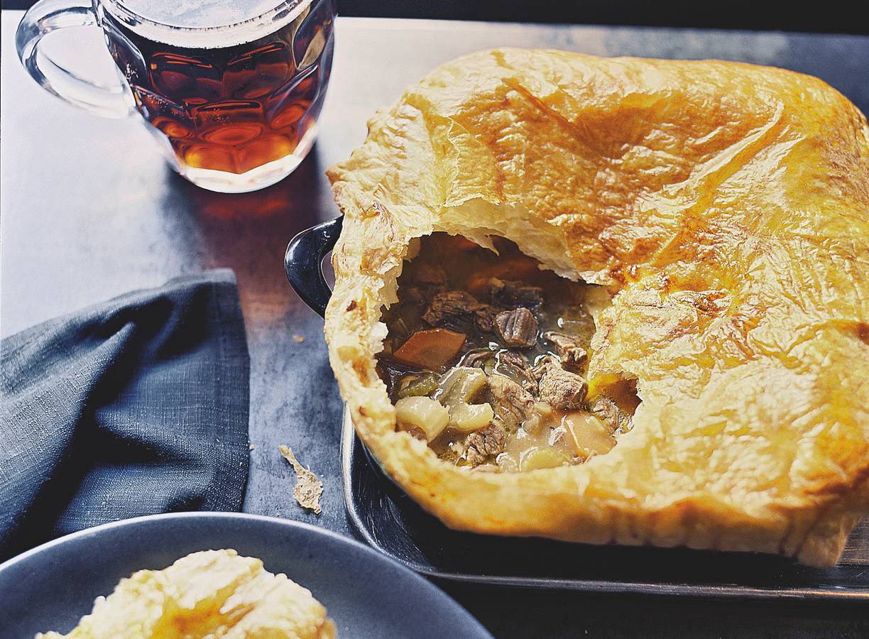 Mals rundvlees gestoofd in bier, onder een dakje van knapperig bladerdeeg.