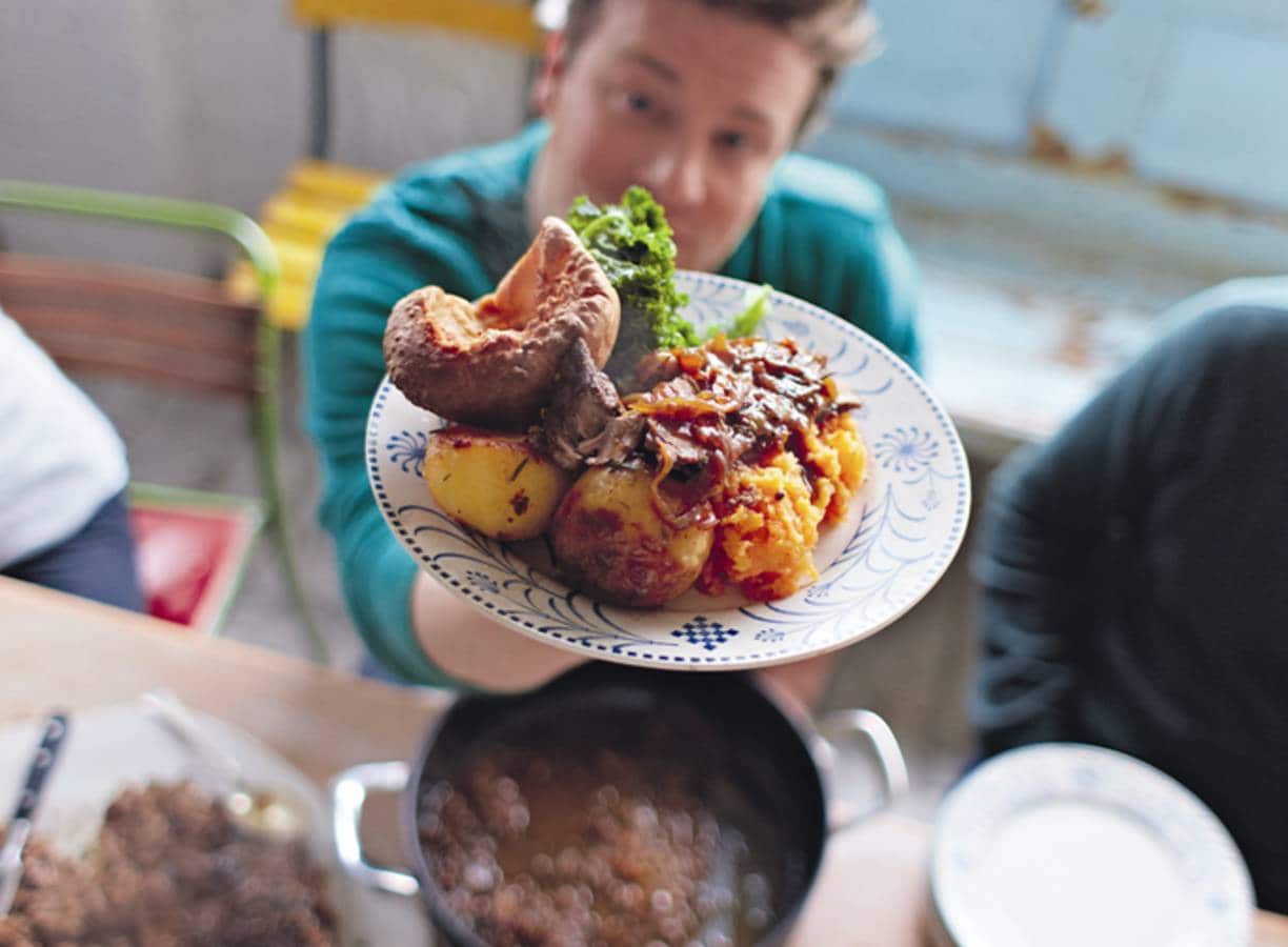 Zet intussen een plat muffinbakblik met een scheutje zonnebloemolie in elk bakje in de oven om heet worden. Doe de bloem met een snufje zout in een kan en klop er eerst de eieren en vervolgens de melk door tot je een glad beslag hebt.