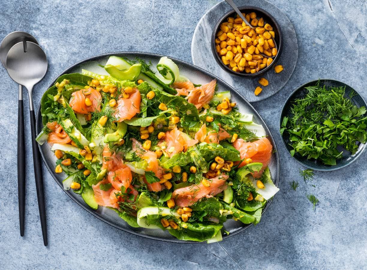Frisse salade met o.a. zalm, avocado en komkommer. We brengen 'm op smaak met verse dille, peterselie en een mosterddressing. Al in 20 minuten heb je 'm op tafel staan.
