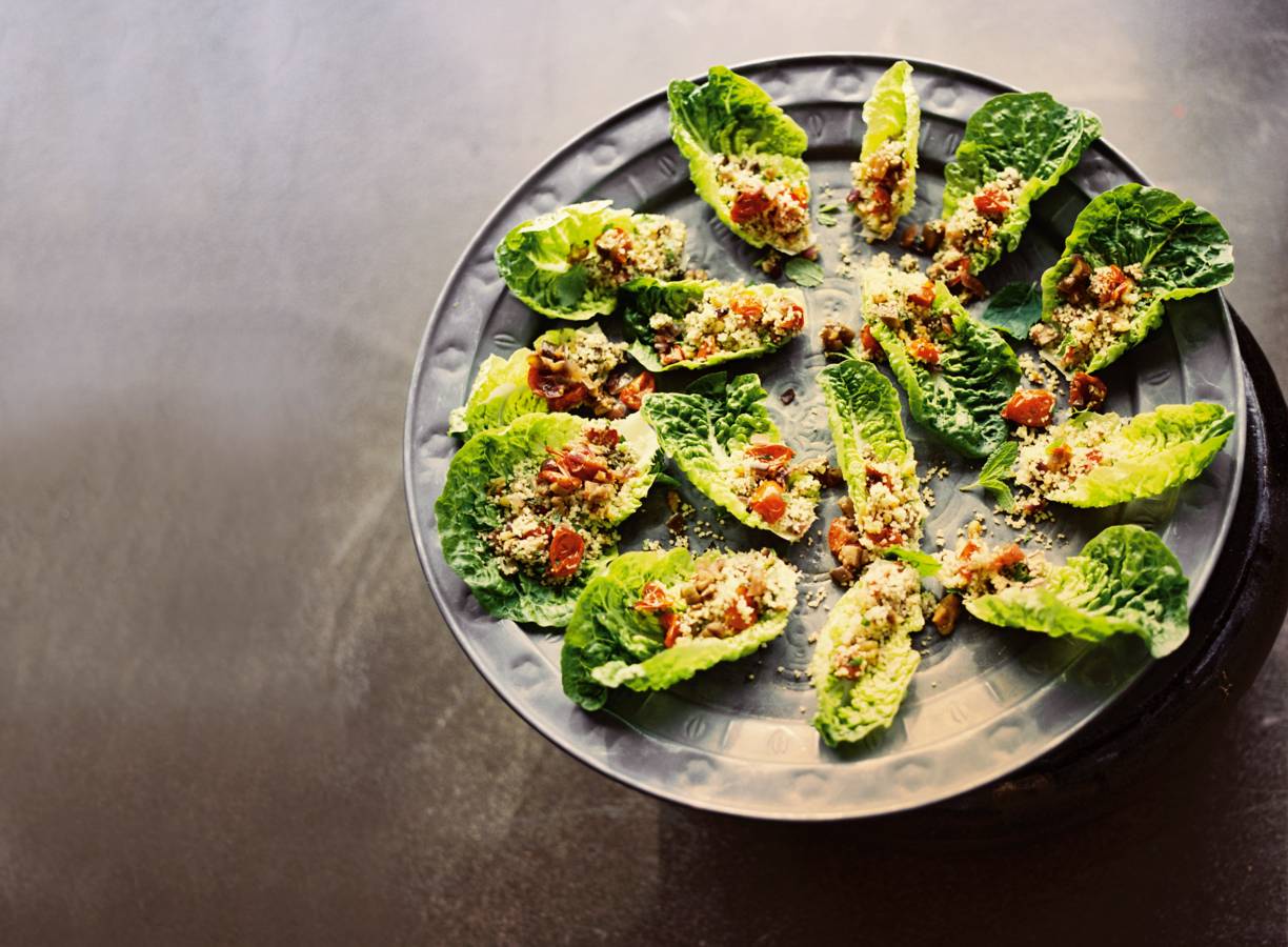 Zin in een chic hapje? Ovengeroosterde groenten met noten en couscous op blaadjes babyromaine.