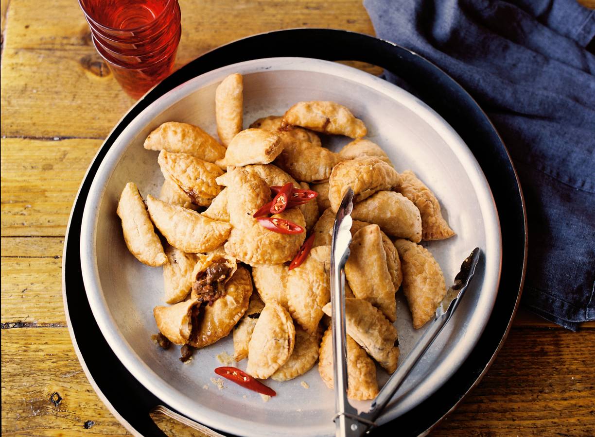 Je vult het deeg met kruidig stoofvlees. Van dit hapje blíjf je eten.