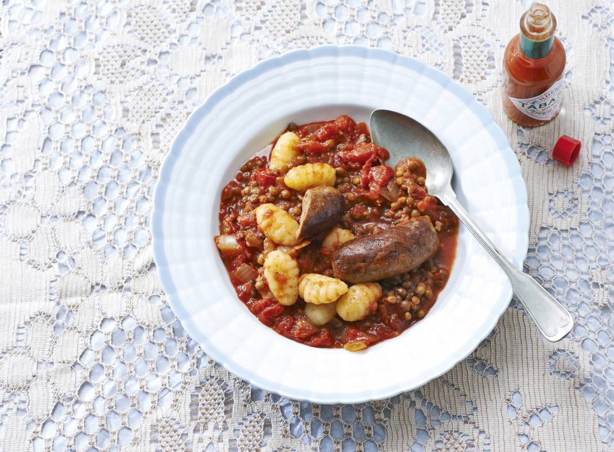 Giet de gnocchi af en schep door de linzen met worstjes. Voeg eventueel zout en extra tabasco toe.