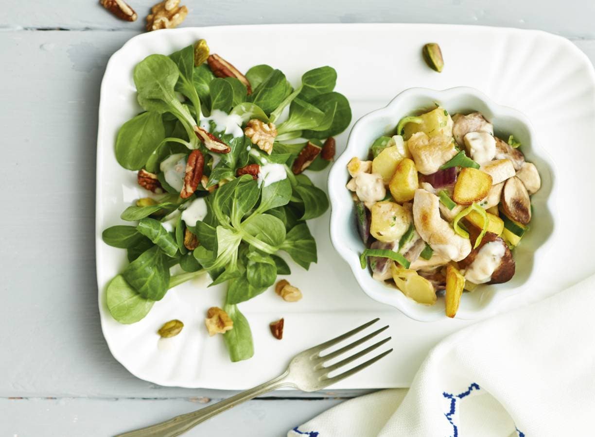 Aardappel-kip-groenteschotel met notensalade