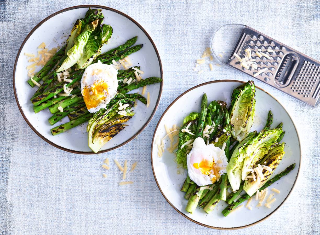 Door de minikropjes sla en asperges te grillen, behouden ze hun bite. En dat gepocheerde eitje maakt het chic: perfect als je gasten hebt.