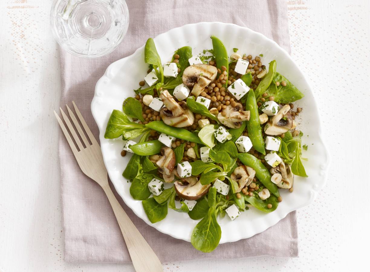 Laat de linzen uitlekken en hak de hazelnoten grof. Snijd de champignons in kwarten.Kook de sugarsnaps 3 min., giet af en spoel koud onder stromend water. Doe de sugarsnaps samen met de linzen en veldsla op een platte schaal. Verhit de grillpan en rooster de noten in 3 min. goudbruin. Laat afkoelen op een bord. Laat de pan op het vuur staan.
