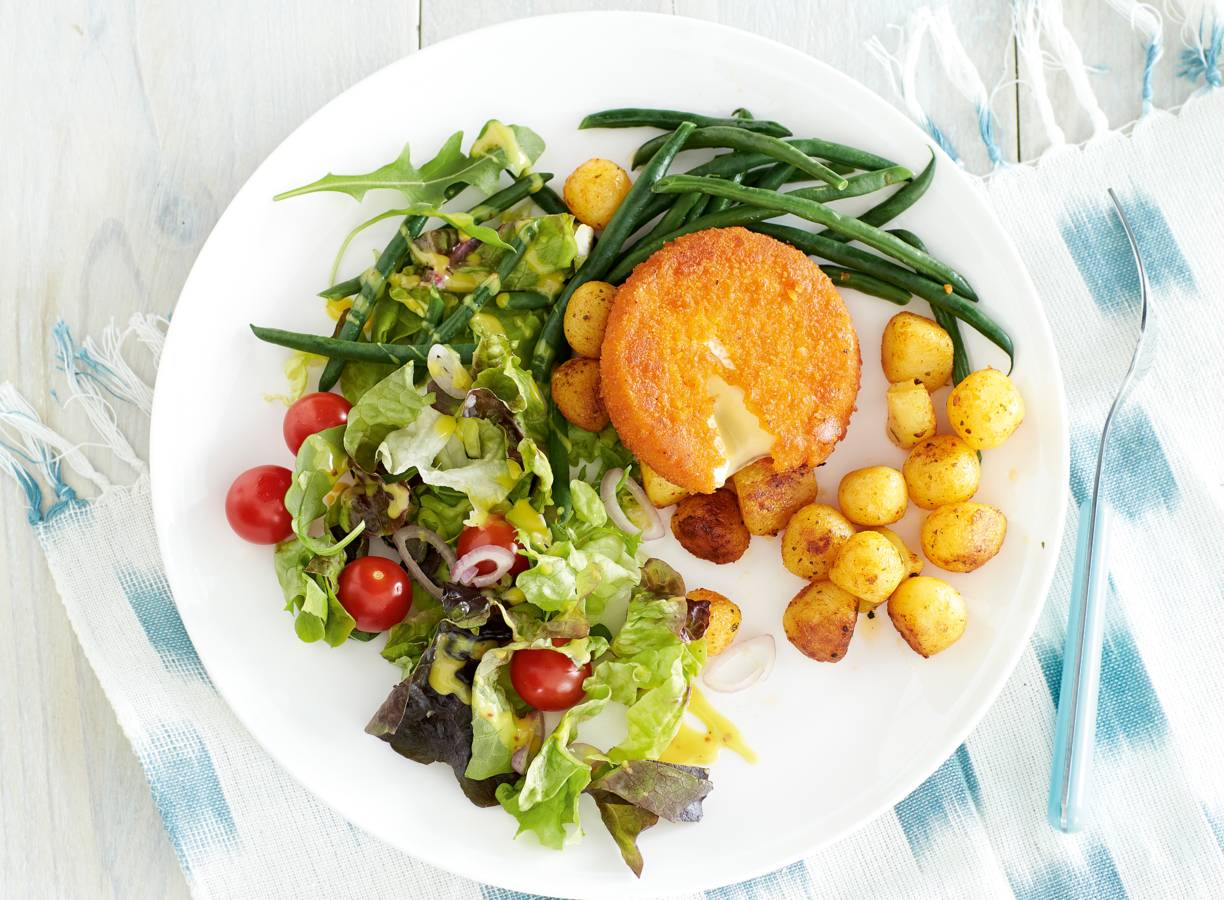 Snijd de sjalotten in dunne halve ringen. Verdeel de sla, haricots verts, tomaten en sjalot over de borden. Besprenkel met de dressing. Leg de camemberts erop. Serveer met de krieltjes.
