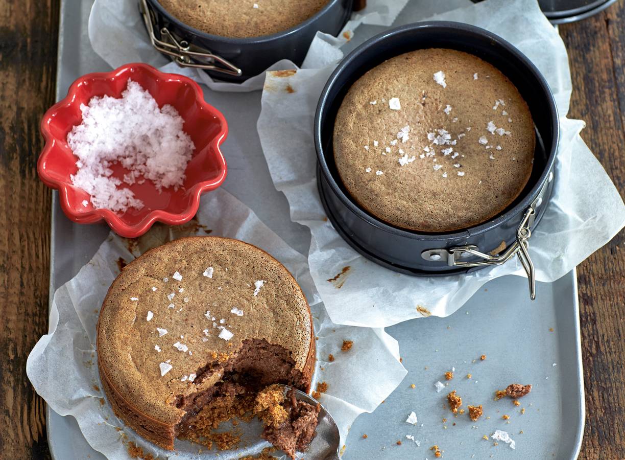 Laat de taartjes in de vorm op een rooster afkoelen tot kamertemperatuur. Snijd met een mesje de zijkanten los en haal de cake uit de vormpjes. Bestrooi de taartjes met het zeezout.