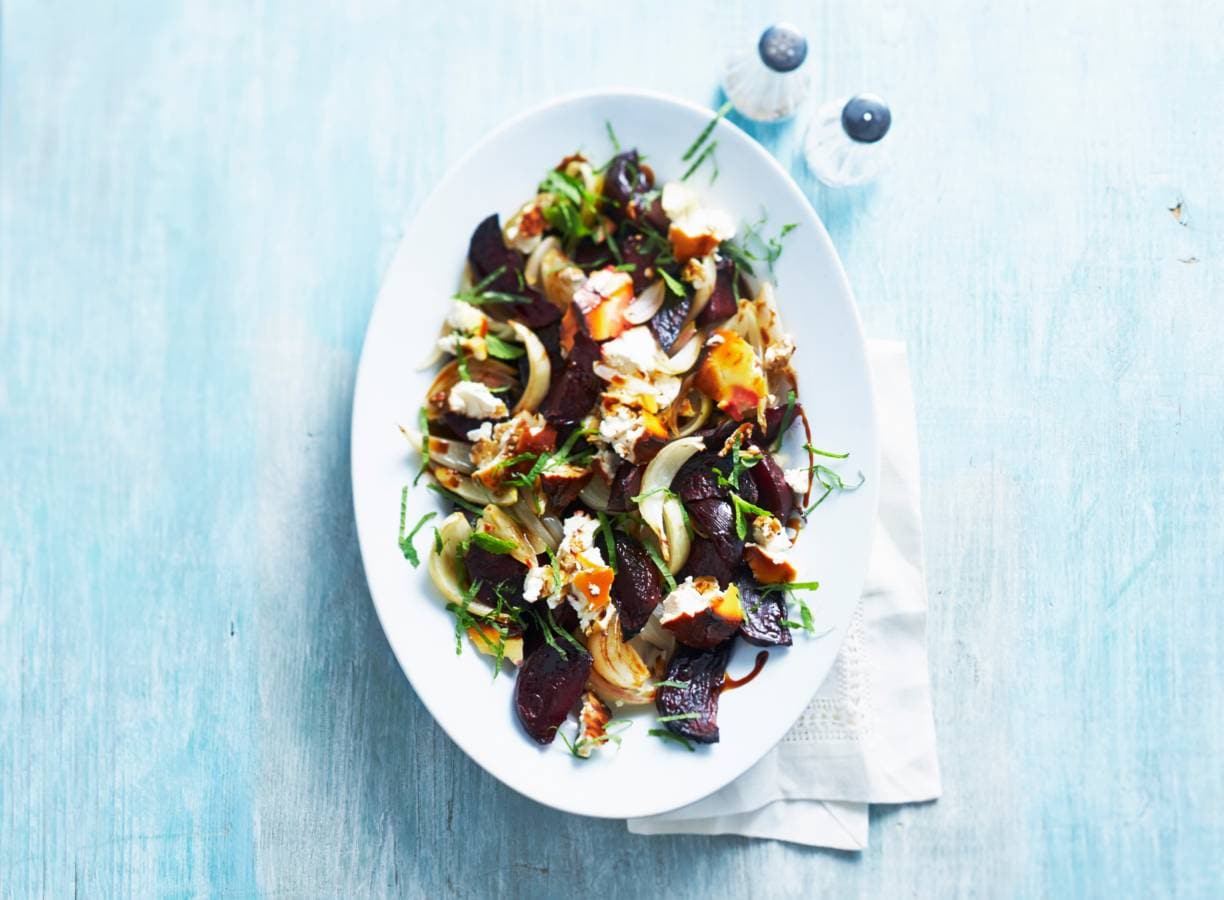 Snijd ondertussen de muntblaadjes fijn. Verdeel de bieten en ui over een schaal. Verdeel de ricotta er in stukken over. Besprenkel alles met de azijn en bestrooi met de munt.