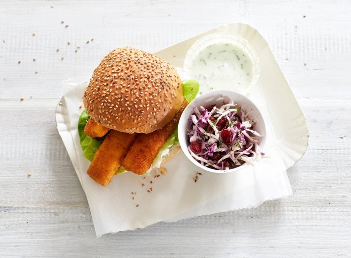 Snijd de broodjes open en verdeel de botersla en vissticks erover. Serveer met de dressing en koolsalade.