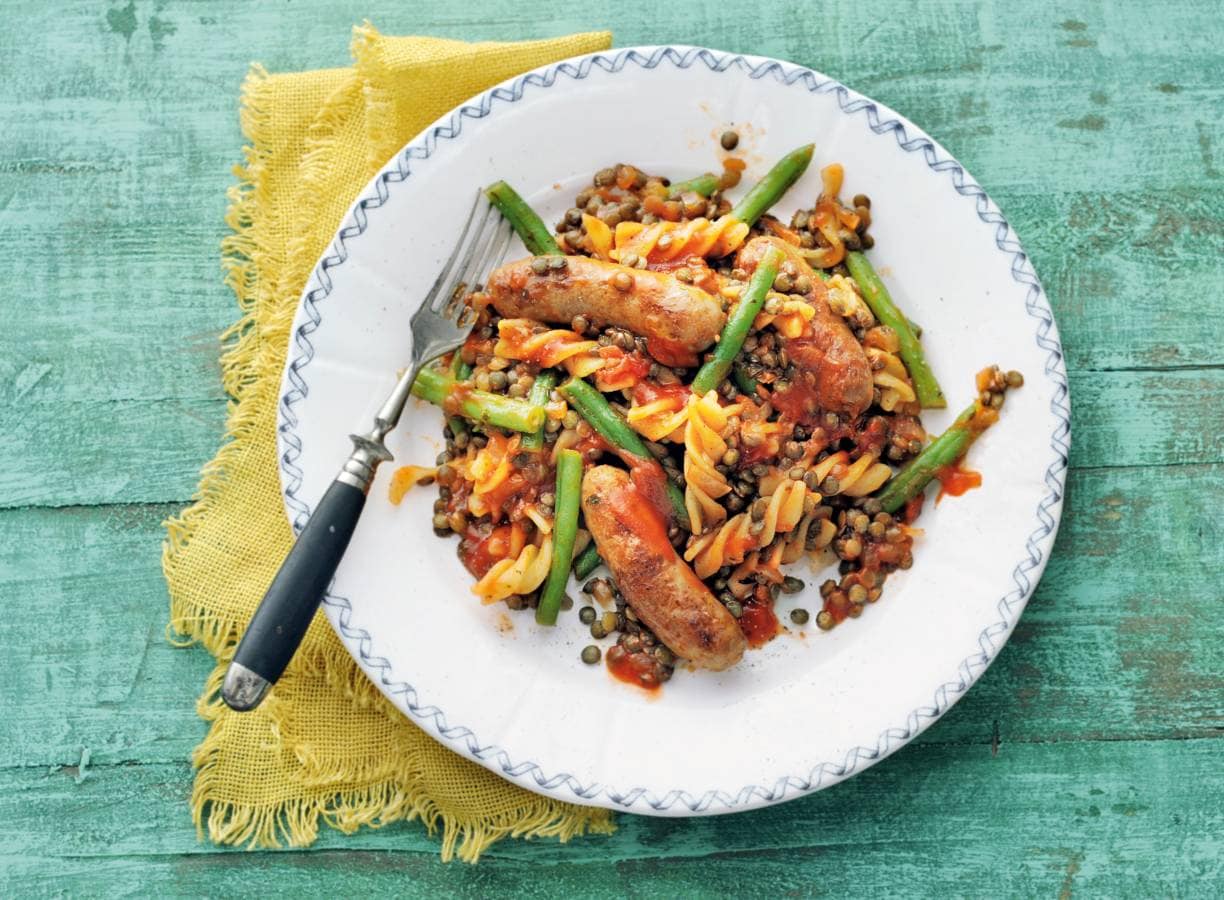 Giet de linzen en pasta af en voeg toe aan de saus. Schep om en serveer.