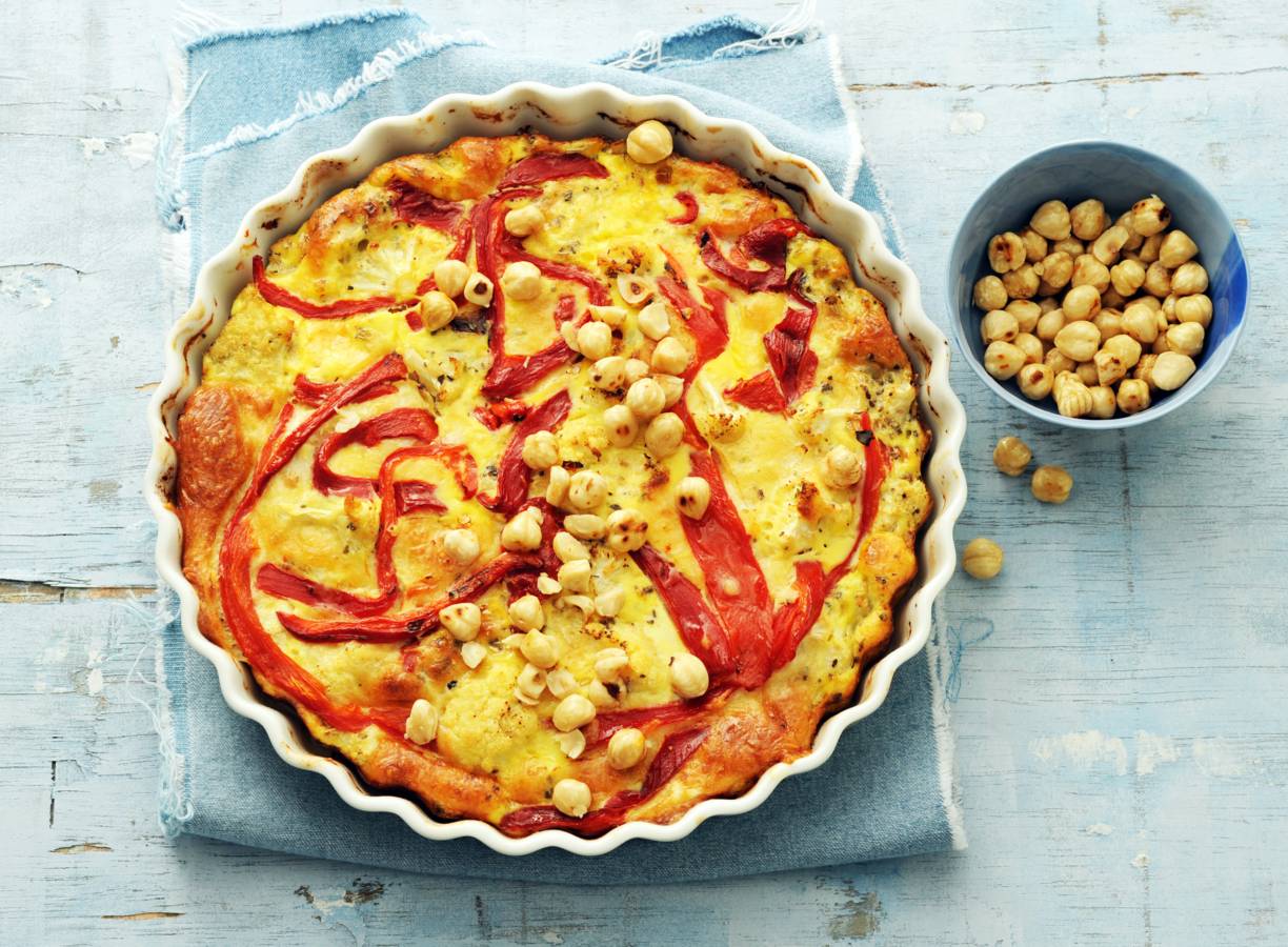 Verhit ondertussen een koekenpan zonder olie of boter en rooster de hazelnoten in 2 min. goudbruin. Laat afkoelen op een bord en hak grof. Bestrooi de frittata met de hazelnoten en serveer. Lekker!
