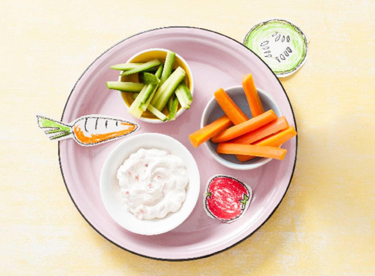 Snijd de komkommer in dunne repen. Schil de bospeen, snijd in repen en kook in 3 min. Giet af. Serveer de dip met de komkommer en peen. Doe aan je baby voor hoe hij de groenten in de dip moet dopen.