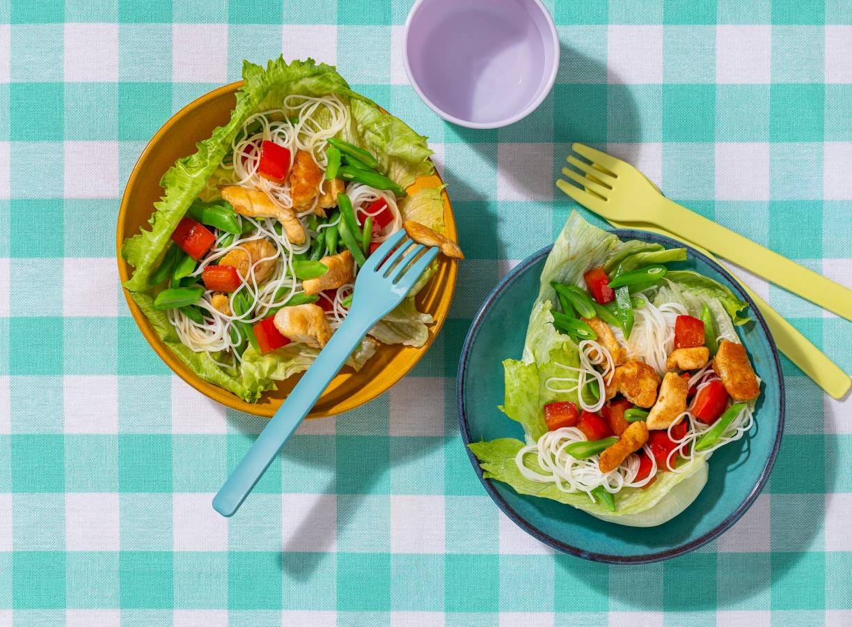 Kook ondertussen de snijbonen 6 min. en giet af. Haal 4 mooie bladeren (per 4 porties) van de ijsbergsla. Maak de paprika schoon en snijd het vruchtvlees in blokjes. Bereid de mihoen volgens de aanwijzingen op de verpakking en knip met een schaar in stukken. Hak de knoflook fijn.
