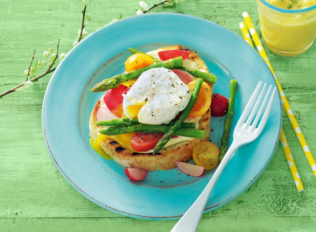 Bestrijk ondertussen het brood met de mayonaise. Schep de salade van lentegroenten erop.