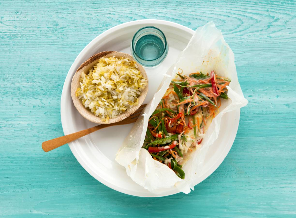Leg de vispakketjes op borden en vouw ze open aan tafel. Serveer met de rijst.