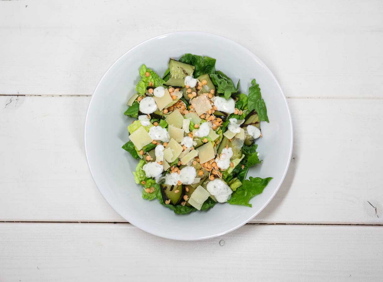 Doe de romainesla in een schaal. Voeg daarna de gegrilde courgette en linzenkiemen aan de salade toe. Strooi het Parmezaanse kaasschaafsel over de salade en besprenkel met de yoghurtdressing met kruiden. Mix dit vervolgens nog eens goed.