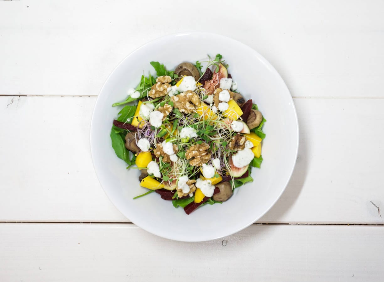 Snijd de mango en vijgen in hapklare stukjes. Hussel de jonge bladsla met rucola, samen met de gegrilde champignons en de geraspte bietjes in een schaal. Verdeel de gesneden vijgen, mango en kiemgroente over de salade. Voeg hier de walnoten, yoghurtdressing met kruiden en de rucolacress aan toe. Even husselen en genieten!