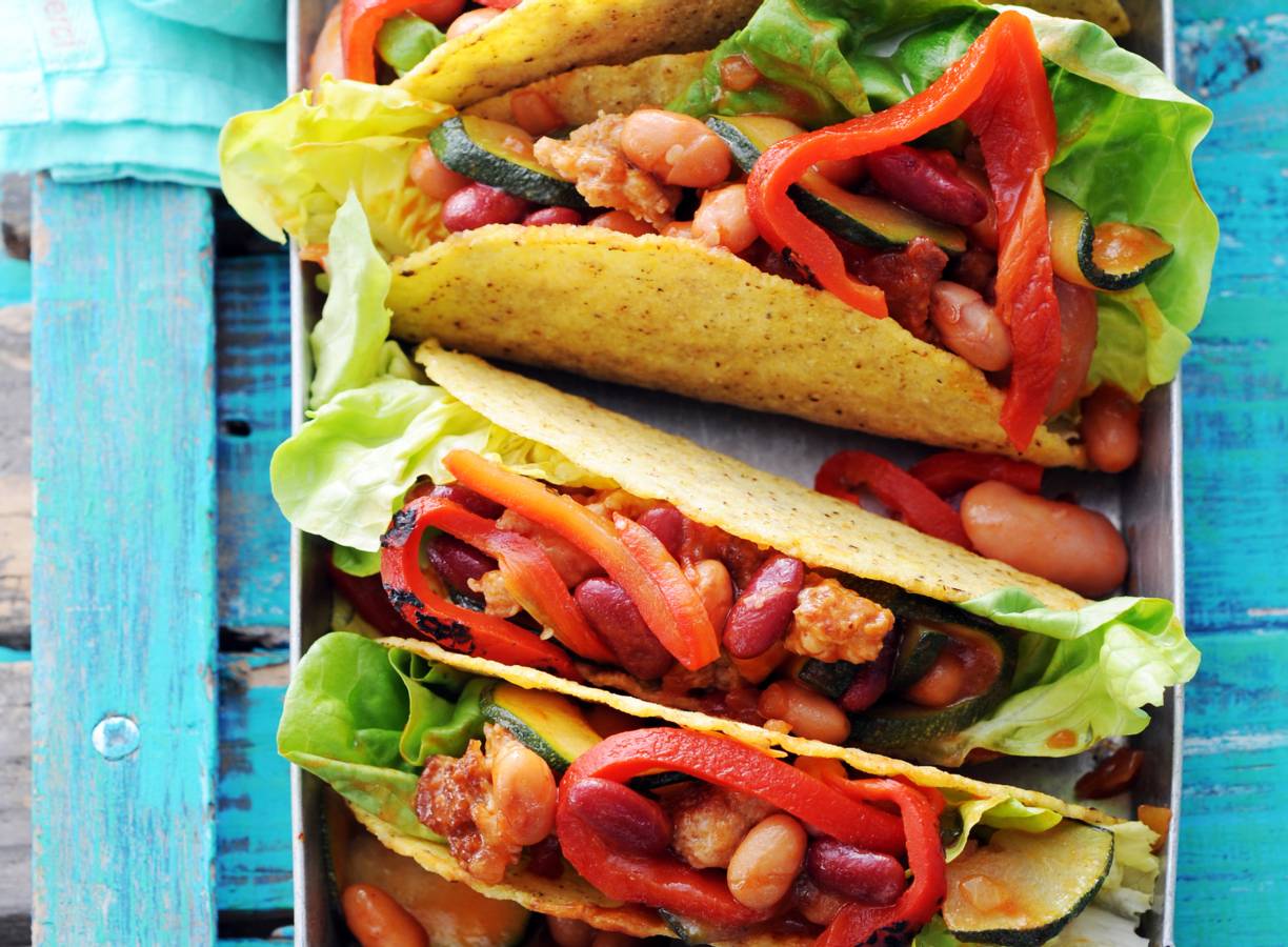 Verwarm ondertussen de tacoschelpen ca. 5 min. in de oven. Leg de schelpen in een schaal. Vul ze met de botersla en het worstmengsel en garneer met de reepjes paprika.