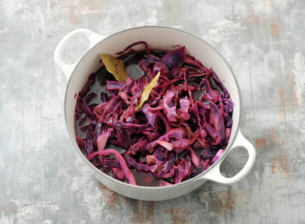 Snijd de rodekool in de lengte in parten. Verwijder de harde kern en snijd de kool in reepjes van ½ cm breed. Verhit een pan met dikke bodem en voeg de rodekool, het water, de laurierblaadjes, ruby port, pruimenjam en de cayennepeper toe. Laat 30 min. met de deksel op de pan op laag vuur koken. Breng op smaak met zwarte peper en eventueel zout.