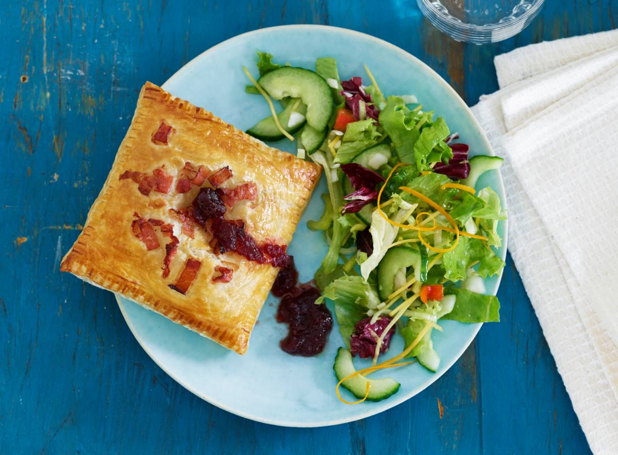 Geitenkaas, ham en cranberrycompote, allemaal in één verrassingspakketje.