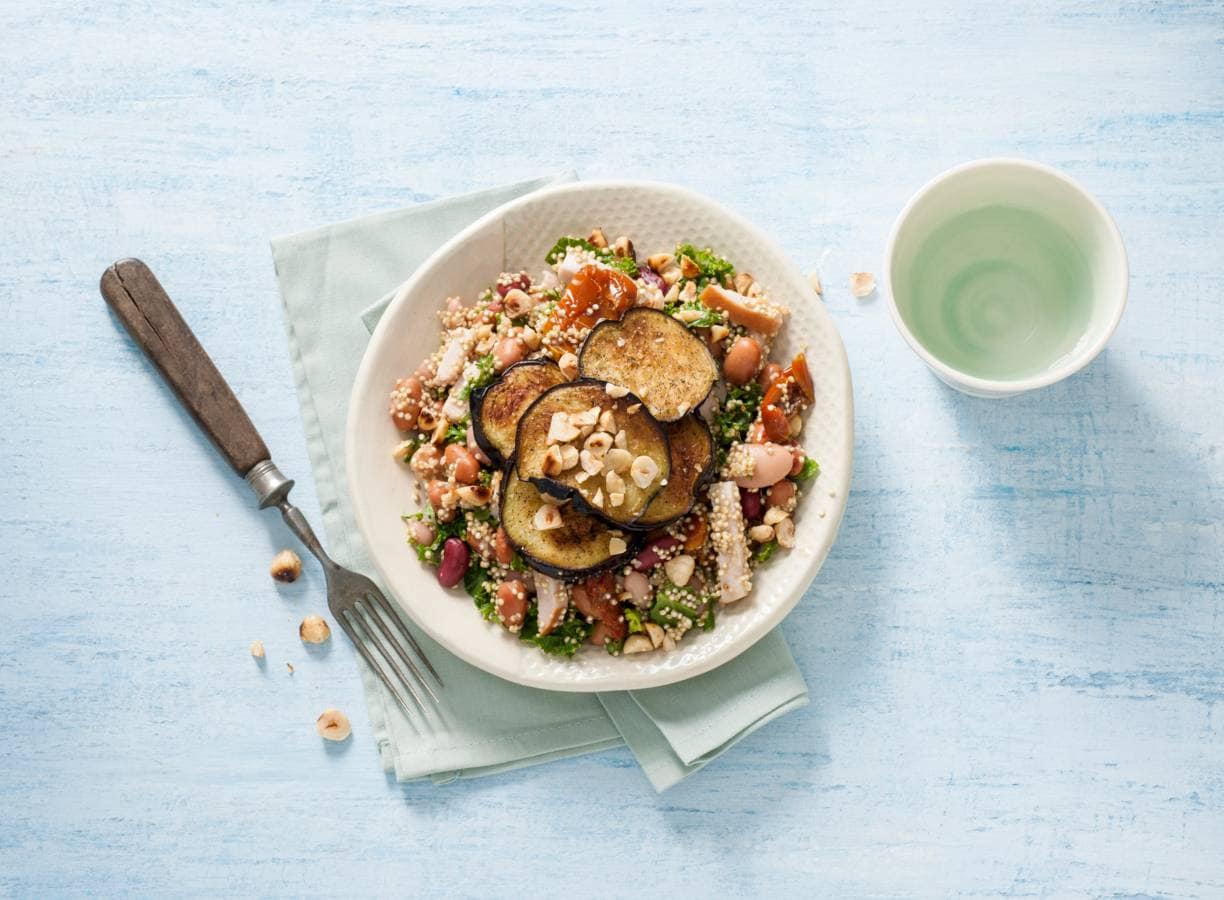 Meng de quinoa met de bonen, gedroogde tomaten, opgevangen olie, kipreepjes en babyboerenkool. Verdeel het quinoa-bonenmengsel over de borden en garneer met de aubergine en hazelnoten.