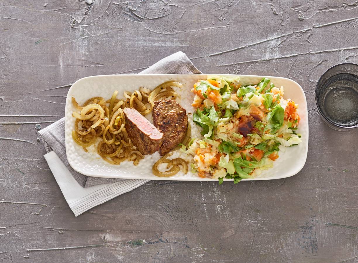 Serveer de andijvie-wortelstamppot met de steak en uienjus.