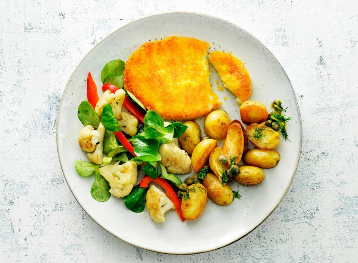 Verhit de rest van de olie in een koekenpan en bak de kaasburgers in 5 min. op middelhoog vuur goudbruin. Keer halverwege. Neem de bakplaat uit de oven en meng de warme bloemkool en paprika in een kom met de dressing. Meng voorzichtig de veldsla erdoor. Serveer met de krieltjes en kaasburgers.