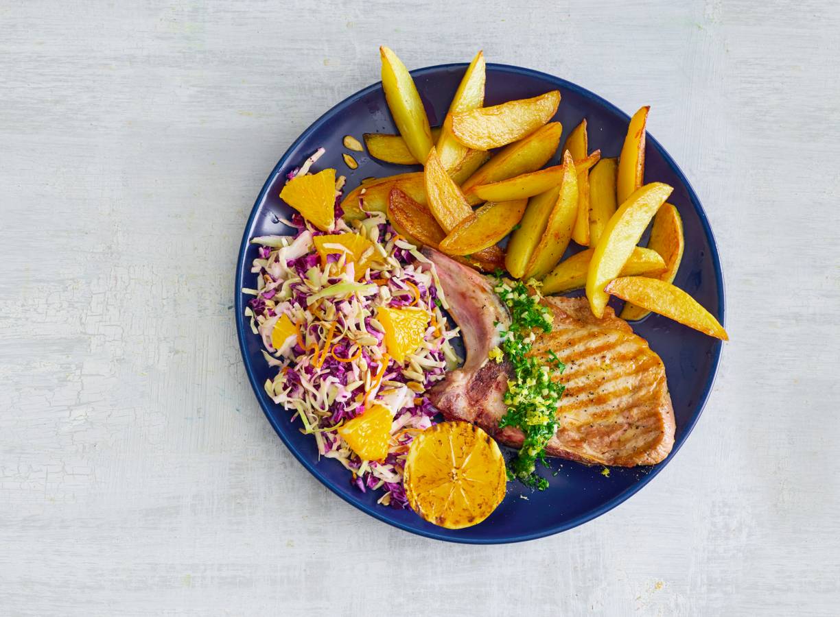 Meng het sinaasappelrasp en -vruchtvlees met de rodekool, spitskool, 2/3 van de zonnebloempitten en dressing in een schaal. Bestrooi met de rest van de zonnebloempitten. Snijd de peterselie fijn, maak de knoflook schoon en snijd fijn. Meng het citroenrasp, de knoflook, peterselie, de rest van de olie en 1 el water. Breng op smaak met peper en eventueel zout. Serveer de gebakken aardappelen met de salade en karbonades. Verdeel het citroen-peterseliemengsel over het vlees en garneer met de gegrilde citroen.