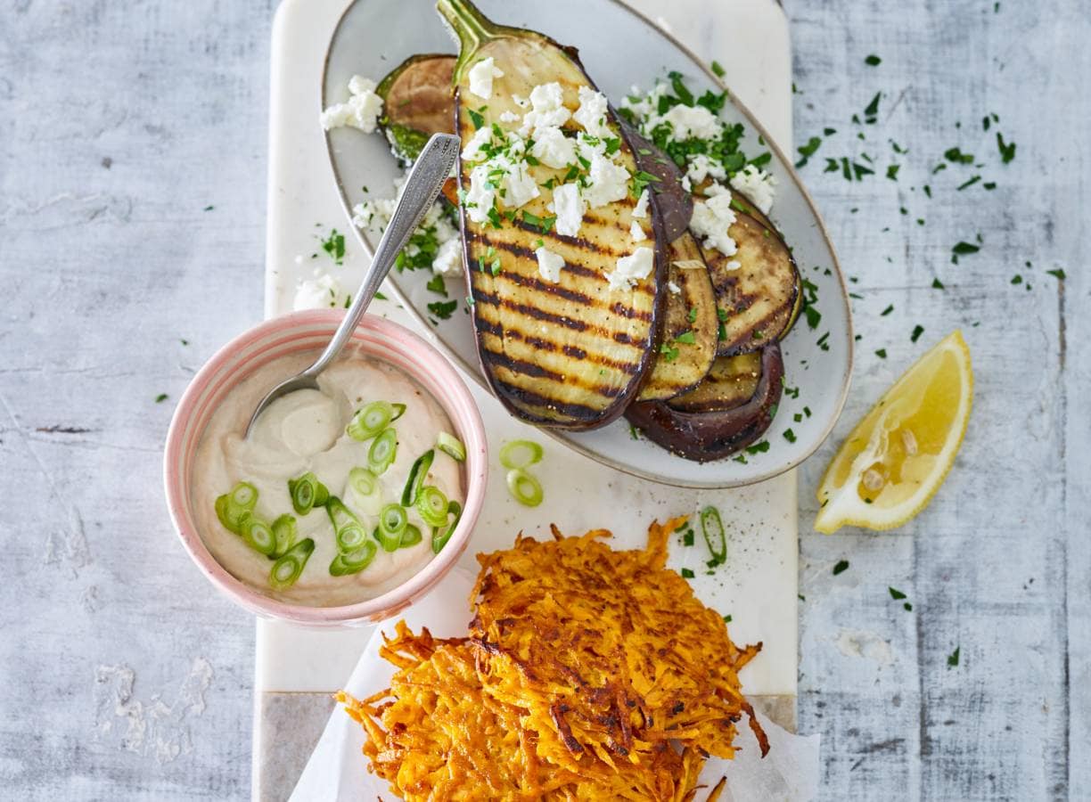 Monique van Loons zoete-aardappellatkes met auberginesalade