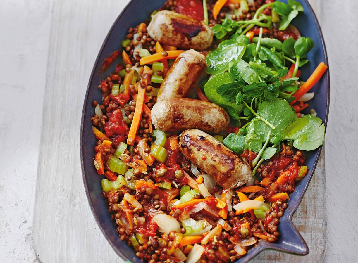 Meng ondertussen de waterkers met de rest van de olie. Bewaar van één derde van de linzenschotel voor de volgende dag en serveer de rest samen met de worstjes en waterkers.