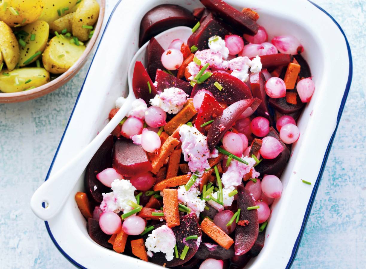 Kook de krieltjes in 15 min. gaar in water met zout. Giet af en laat iets afkoelen. Snijd ondertussen de knoflook fijn. Verhit olie in een hapjespan en fruit de knoflook met de vega spekreepjes 3 min. Schil de bietjes en snijd in parten. Voeg de bietjes, zilveruitjes en vocht, de honing en water toe aan het mengsel in de hapjespan en laat 10 min. stoven met de deksel op de pan.