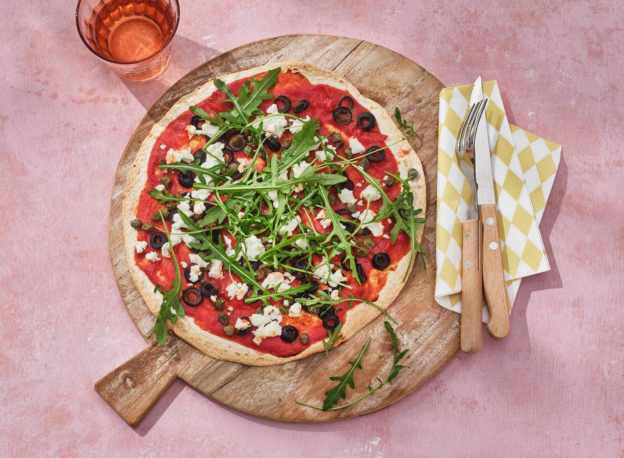 Bak de pizza's ca. 8 min. Verbrokkel de geitenkaas erboven en beleg met de rucola. Bak de pizza nog ca. 1 min.