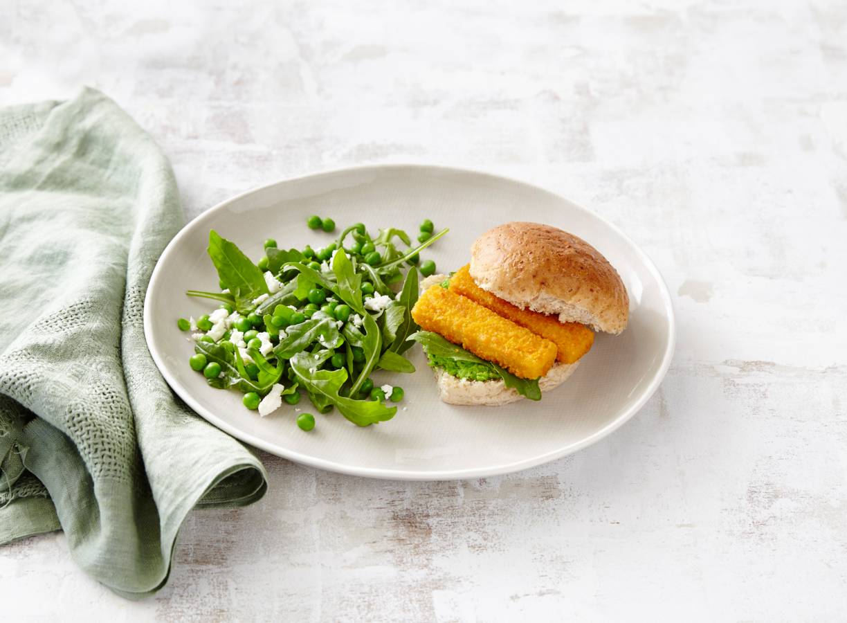 Broodje visstick met rucola-tuinerwten-fetasalade