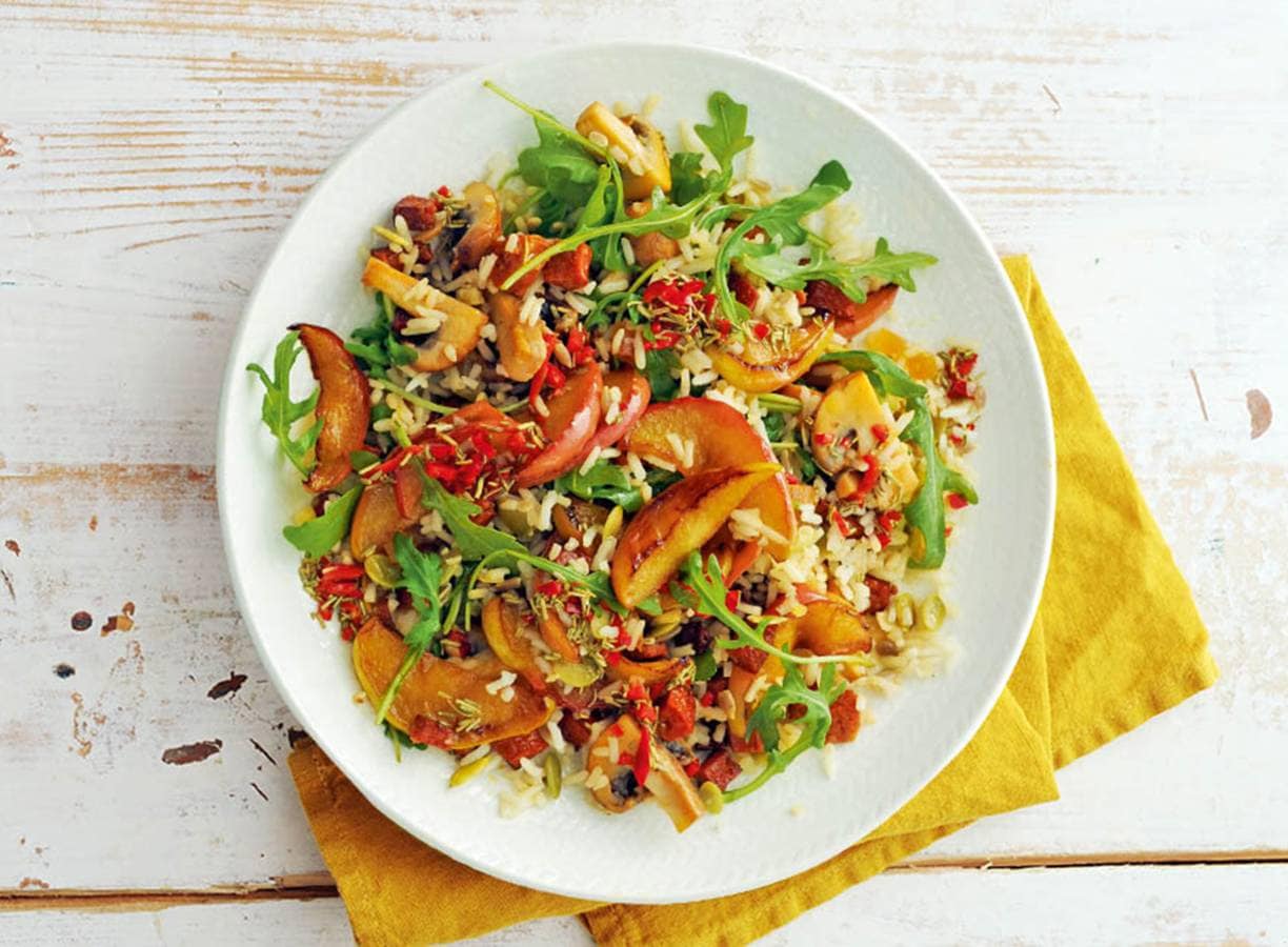 Meng de rijst en het chorizomengsel in een schaal. Schep de rucola erdoor en besprenkel met de dressing.