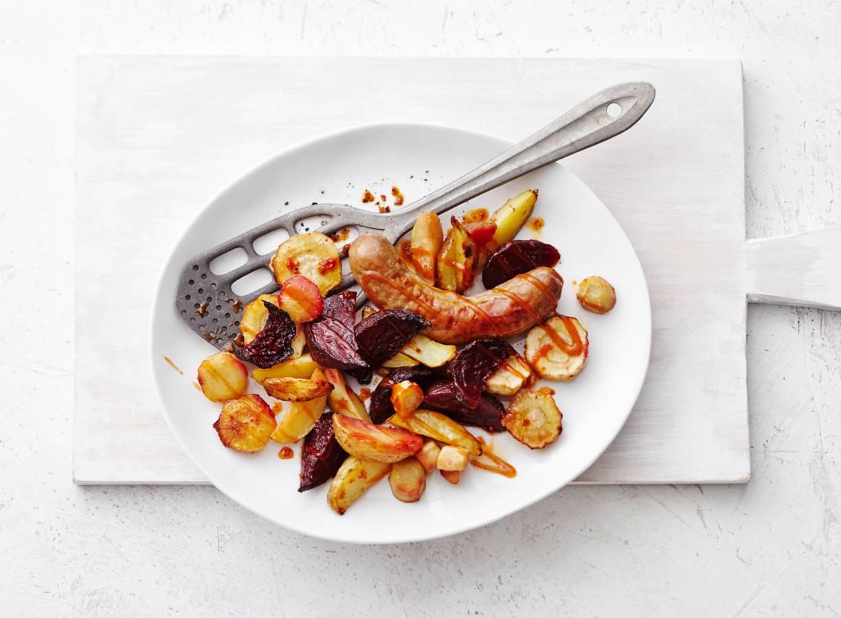 Verwarm de oven voor op 200 °C. Schil de pastinaak en snijd in plakjes van 1 cm dik. Schil de bietjes en snijd in partjes. Meng de pastinaak en bietjes met de aardappelpartjes, olijfolie, peper en eventueel zout.