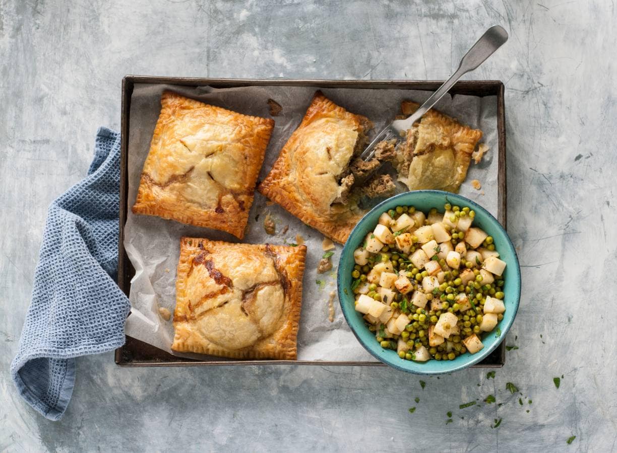 Gehaktwellingtons met frisse doperwten en knolselderij