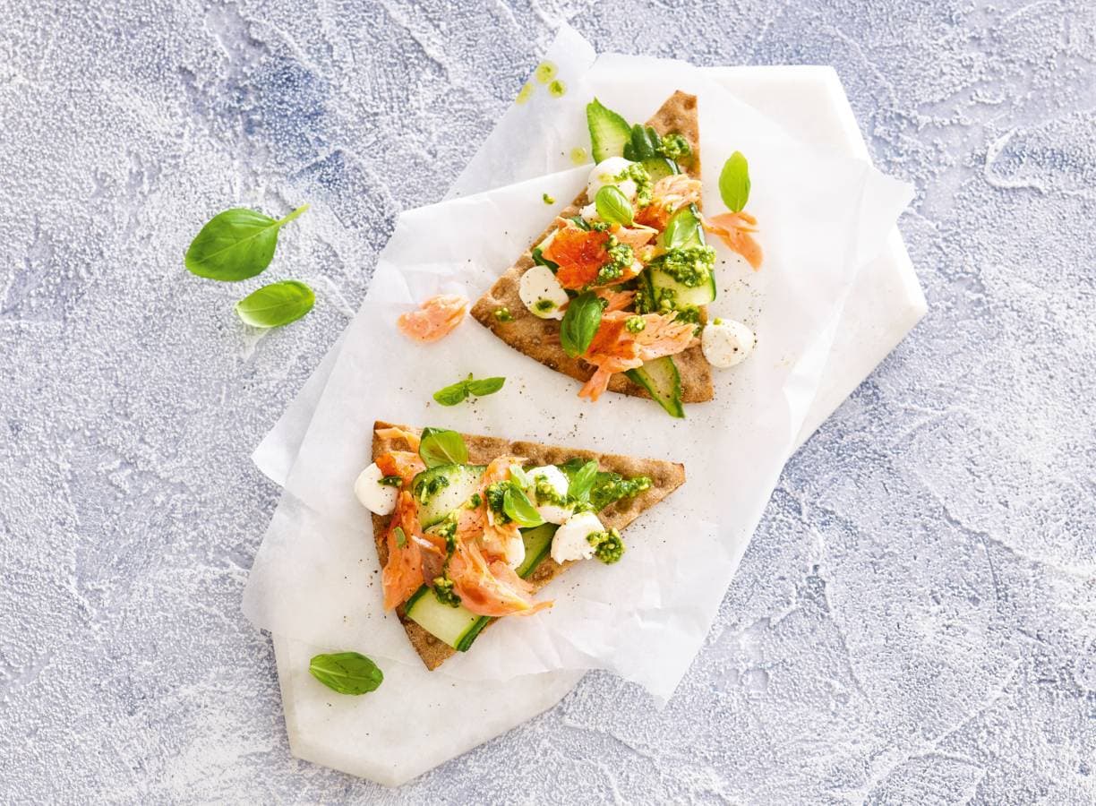Schaaf de komkommer in de lengte in linten en verdeel over het knäckebröd. Halveer de bolletjes mozzarella en verdeel met de zalm over de komkommer. Besprenkel met de pesto en garneer met wat blaadjes basilicum.