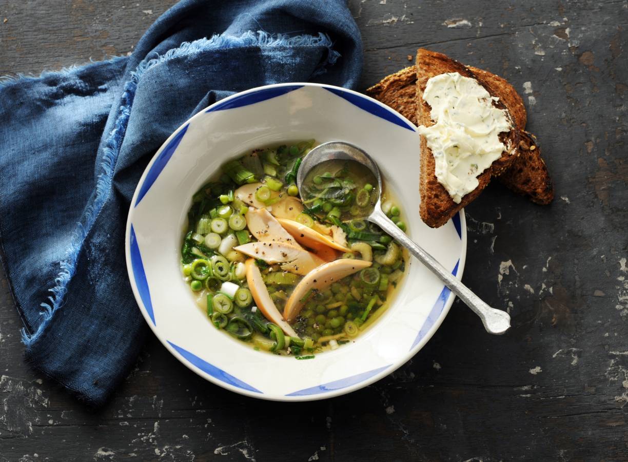 Snelle tuinerwtensoep met gerookte kip en fijne tuinkruiden