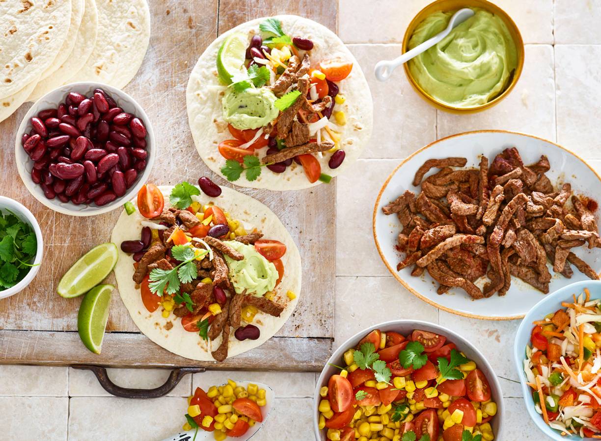 Serveer de wraps met de mais-tomatensalsa, runderreepjes, kidneybonen, rauwkostmix, dressing en de rest van de koriander in aparte bakjes, zodat iedereen zijn eigen wraps kan vullen.
