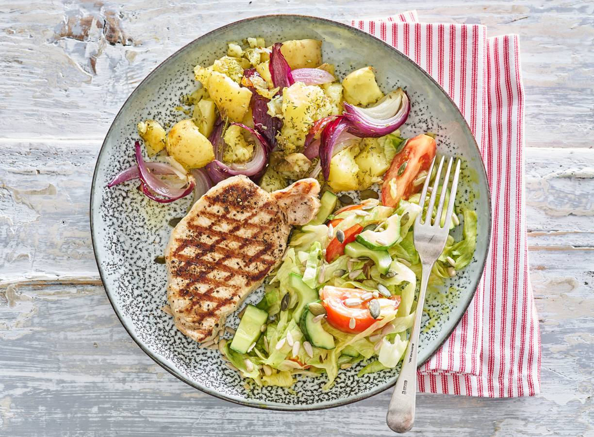 Verdeel de aardappelen en uien over de borden. Leg de filetlapjes erbij en serveer met de salade.