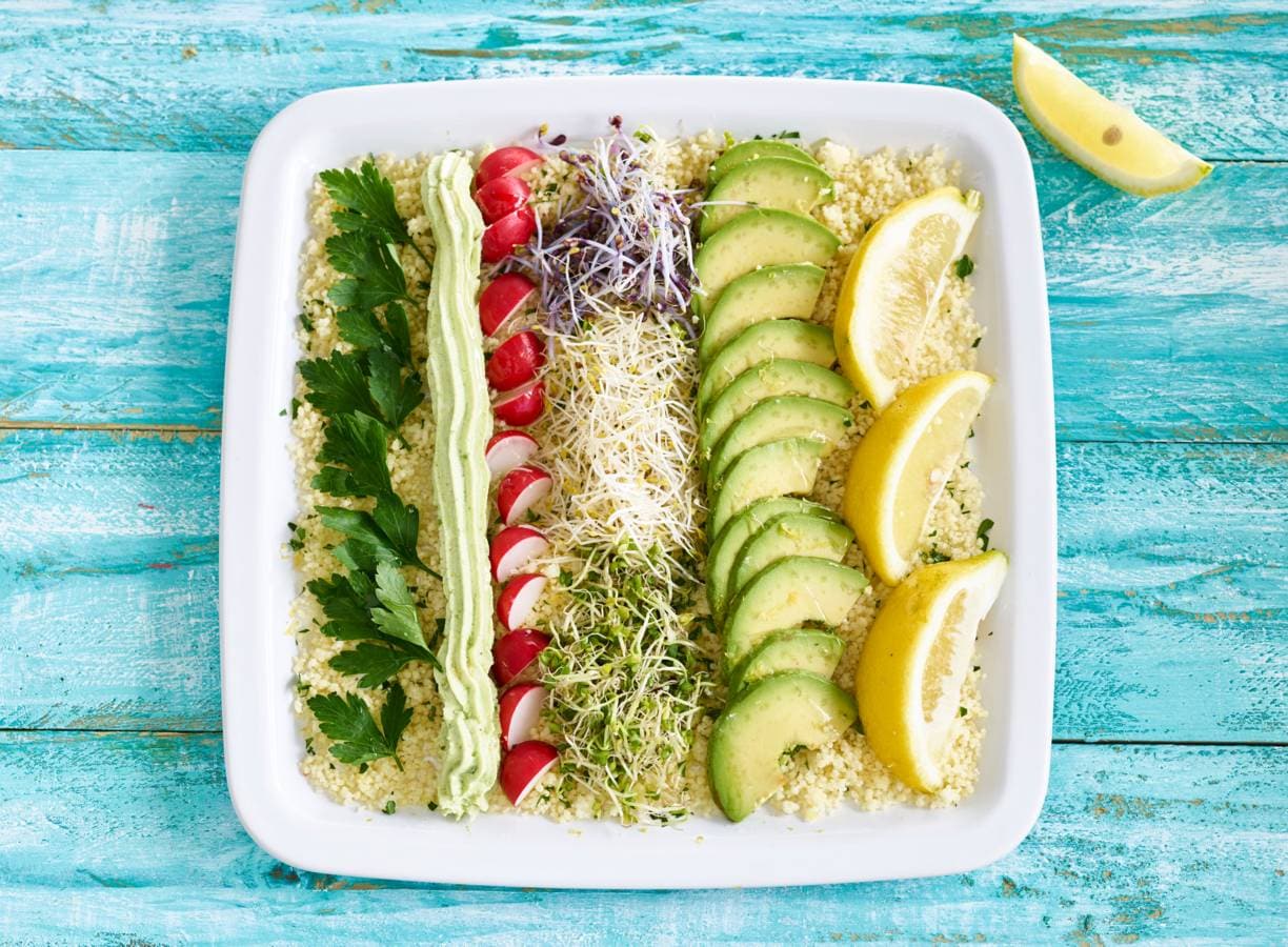 Roer de couscous los met een vork en meng met ⅔ van de (olijf)olie, sesamolie, fijngehakte peterselie, 1 el citroensap (per 2 personen), peper en eventueel zout. Verdeel de couscous over een platte schaal en verdeel hierover in rijen de kiemgroenten, avocadoplakjes, radijspartjes en peterselieblaadjes. Spuit het avocado-geitenkaasmengsel in mooie toefjes over de couscous. Bestrooi met het citroenrasp. Besprenkel met de rest van de olijfolie en garneer met de partjes citroen.