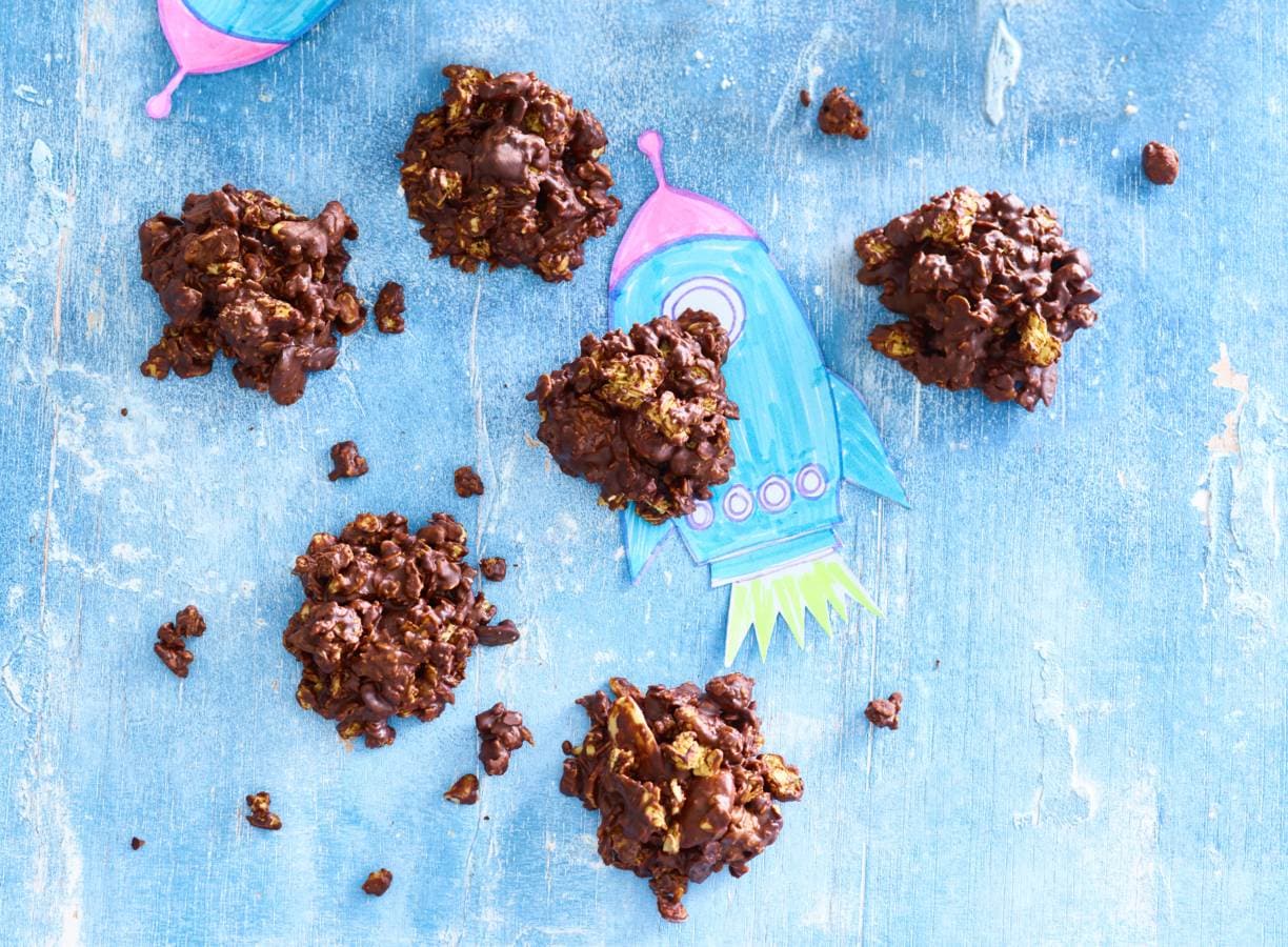Smelt de chocolade au bain-marie. Neem van het vuur. Roer de pindakaas door de chocolade. Meng hier de crunchy muesli door. Vorm met 2 lepels 12 balletjes (meteorieten) van circa 5 cm doorsnede op een met bakpapier beklede bakplaat. Laat 30 min. opstijven in de koelkast.