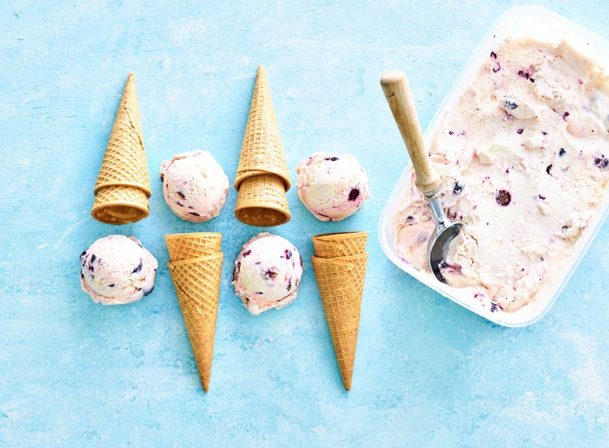 Klop de slagroom stijf en schep door de yoghurt. Kneus de helft van de blauwe bessen een beetje en meng samen met de lemoncurd door het yoghurtmengsel. Schep in een plastic bak en laat 4 uur opstijven in de vriezer. Schep elk half uur om.