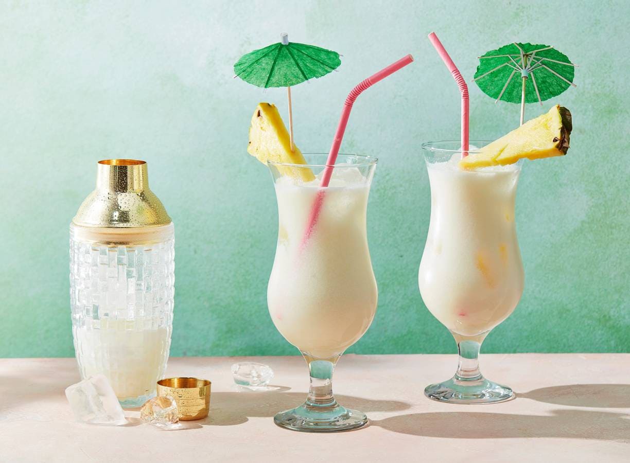 Vul de cocktailglazen met ijsblokjes en schenk de pina colada door een zeefje erin. Garneer met een stukje ananas en een parapluutje.