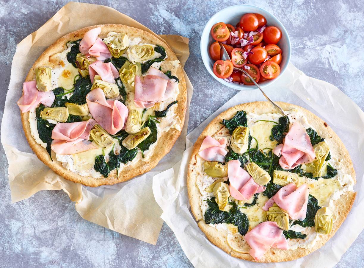 Probeer eens een witte pizza! Beleg 'm met ham, spinazie en artisjok.