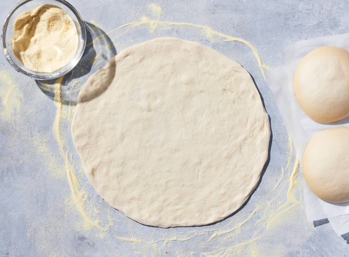Bestuif het werkblad met wat griesmeel. Neem 1 bol deeg en vorm er een pizzabodem van. Druk daarvoor de bol plat en duw met je vingers tot een pizza van Ø 25 cm en de rand hoger is dan het midden. Klop het overtollige griesmeel eraf.