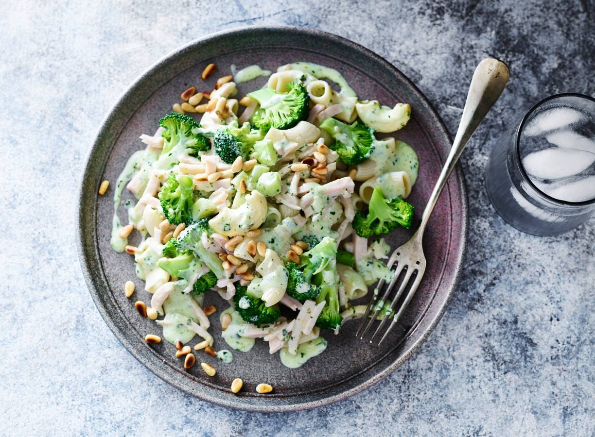 Meng de pasta met de saus, verdeel over diepe borden en schep de kip en groenten erop.