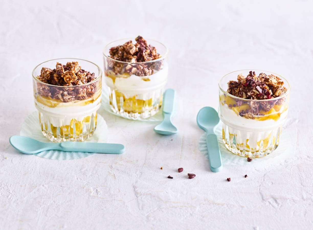 2. Verdeel ⅔ van de mango over 4 glazen en schep vervolgens de hangop erop. Verdeel de rest van de mango, de Noten & Granenrepen in blokjes en de cacaonibs erover. Besprenkel met de rest van de ahornsiroop.