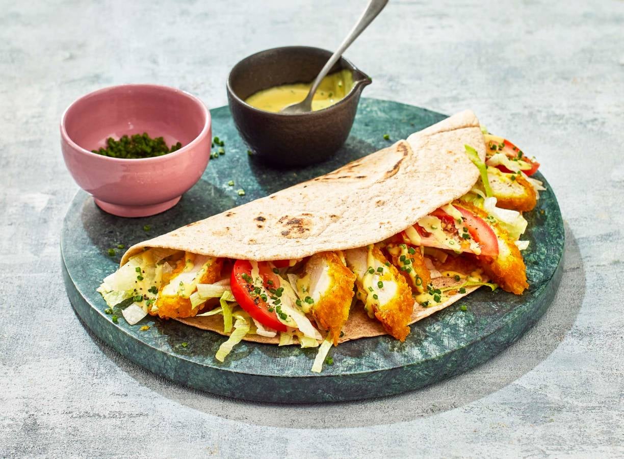 Lekker lunchen met een wrap, gevuld met krokant gebakken kip. Da's weer eens wat anders.